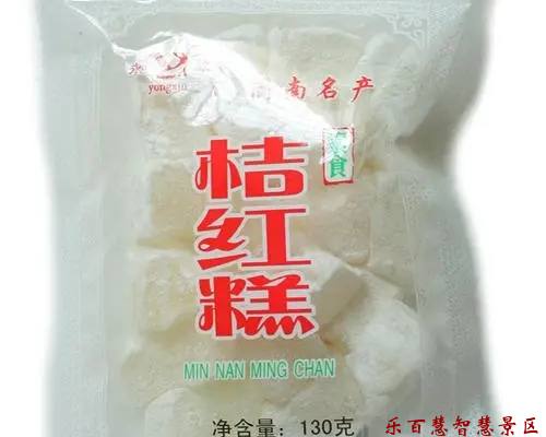 定进口嫩甜鲜爽,富有弹性,质鲜味香。“桔红”即大吉大利之意,婚庆喜宴和送礼不可或缺。男方到女方订婚时,麻枣加饼干作为订婚佳品,女方则用桔红糕、冬瓜糖送给男方致使谢礼;蜜月时期,新娘房中特备热茶、桔红糕,以敬贺客。因之桔红糕亦称“新娘糖”。